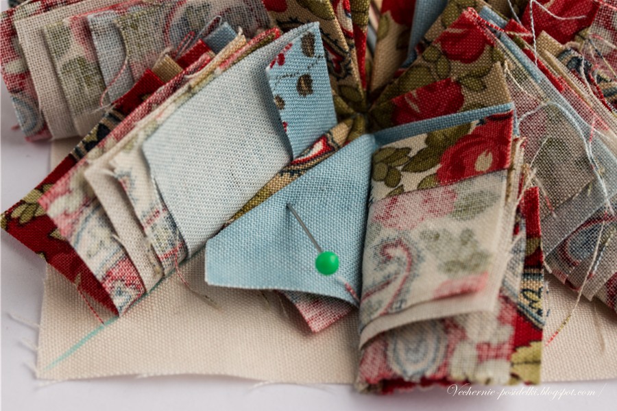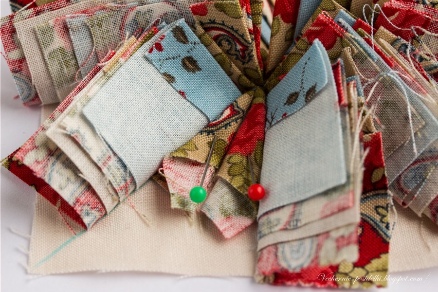 А теперь самое интересное и простое — складываем лучи. Несмотря на то, что на фотографиях ниже ярусы лучей сколоты булавками, вам они не понадобятся, всё удерживается пальцами, это у меня руки заняты фотоаппаратом. :) Пришитые прямоугольники раздвигаем и поехали.