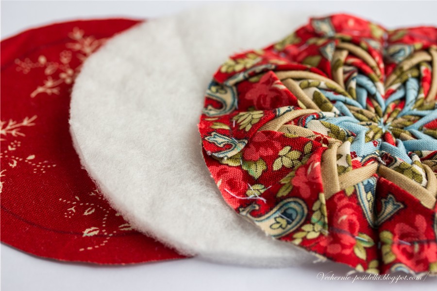Всё-таки я сшила «блинчики» на ёлку! Первые получились комом, но эти два идеального размера — всего 10см, так что выдумывать им другие роли, как в прошлый раз, не пришлось. Заодно и процесс сборки звезды засняла, как вы просили. Фотографий будет много, но пусть вас это не пугает, звезда собирается просто, даже очень просто. Её сборка (без раскроя и без окантовки) заняла у меня всего полтора часа, специально засекала. Шить будем без швейной машины. Во-первых, меня уже несколько раз просили показать что-нибудь, что можно сшить на руках, а, во-вторых, должна же я была привнести в технологию сборки этой звезды хоть что-нибудь (сама то идея не моя, а жаль :)).
