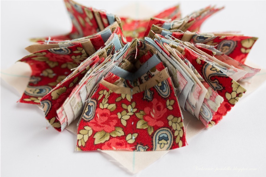 Аналогичным образом пришиваем оставшиеся ряды. Важно: следите за центром, вкалывайте иголку точно в него, пришивая первый прямоугольник каждого ряда. В итоге получится вот такое нечто: