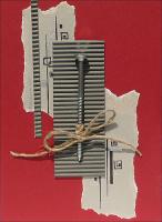 2. Фон из кусочков скрапбумаги, машинная строчка, маска + краска-спрей, карта – бумага для скрапбукинга, дерево – штамп на пленке, чипборд, холнитены (заклепки), вощеный шнур, машина – штамп.