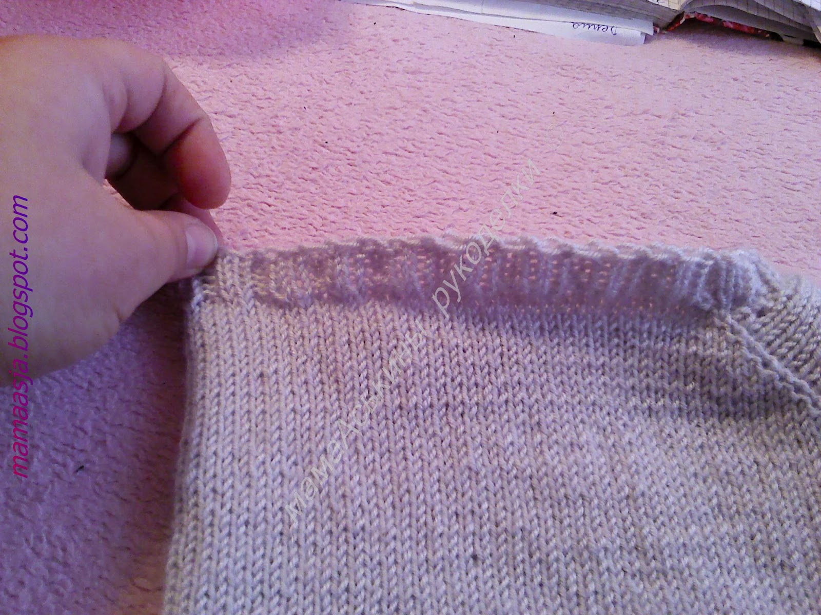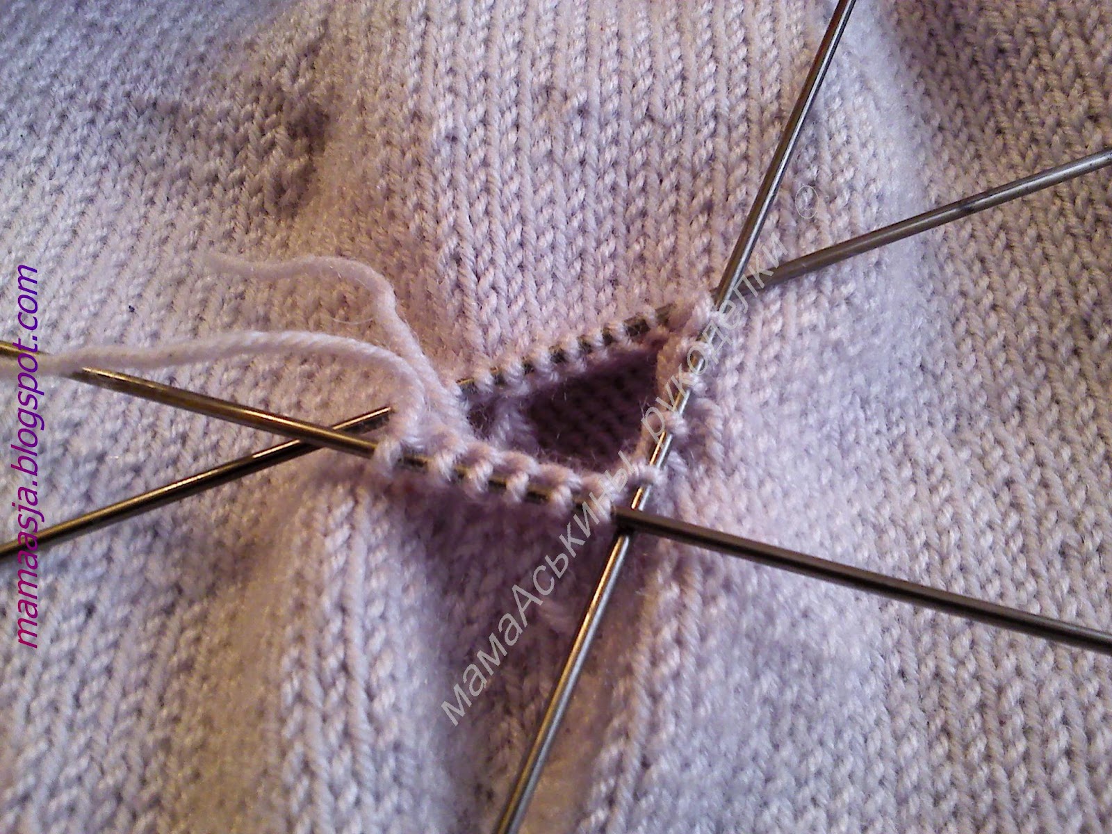 Распускаем бросовую нить по штанине, добираем 10 петель по ластовице и вяжем резинкой 1х1 до необходимой длины. Закрываем петли иглой в таком порядке (нить не затягивать вообще, для того, чтобы оставалась эластичность полотна):