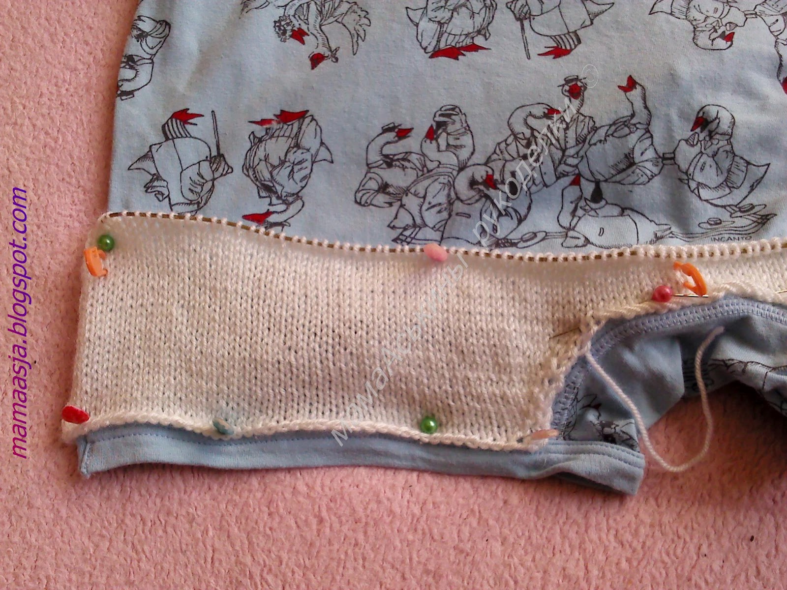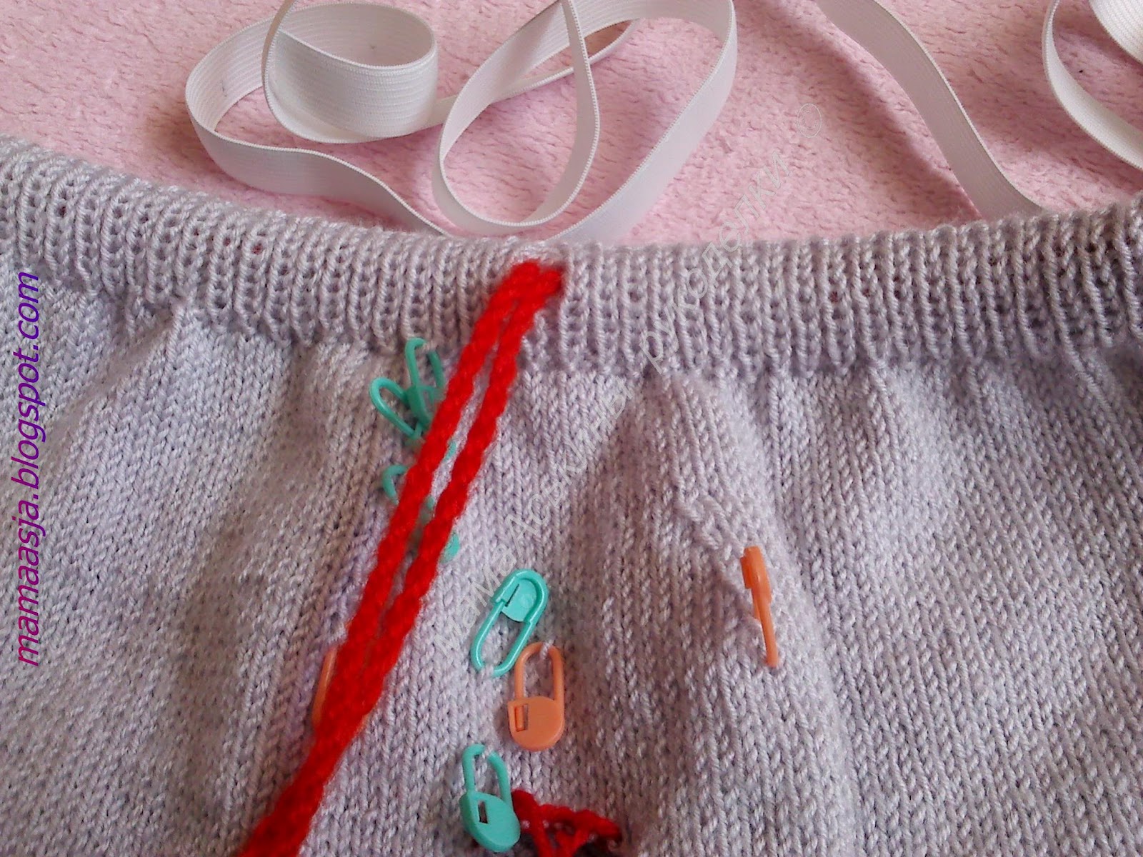 95. Закрыть петли и подшить к первому ряду резинки с изнаночной стороны. В образовавшийся подгиб вставить широкую резинку и шнурок
