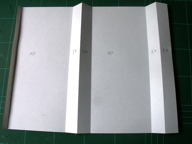 2. Теперь полученный прямоугольник бигуем аккуратно и максимально точно на следующие расстояния от правого края к левому в см: 2.4,2.4,10,2.4,2.4,10 останется маленький отрезок в полсантиметра для склеивания боковинок нашего пакета. После биговки сгибаем так, как показано на фото: