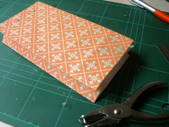 5. В верней части нашей заготовке делаем загиб шириной 3.5 см,и пробиваем отверстия для наших ручек