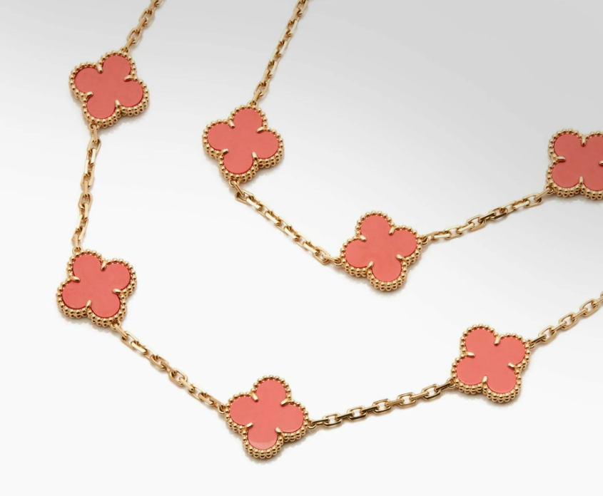 Van Cleef & Arpels также достаточно уделяют внимания кораллам и гармонично и интересно вписывают их в драгоценности. Есть совсем простой и узнаваемый рисунок на браслетахи колье, как на картинке ниже.