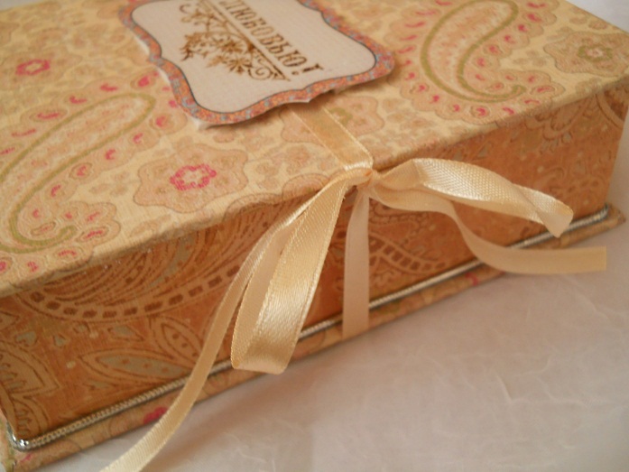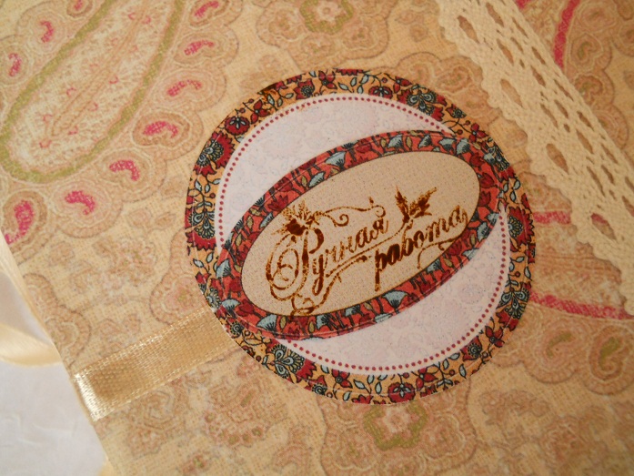 Да, еще ленточки бежевого цвета сделала для завязочек и поместила их под ярлычки на передней крышке и на заднике...