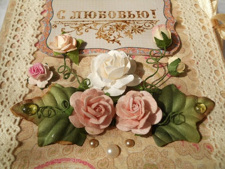 Примеряю: а подойдет ли ярлычок вот такой? Решила, что эмбоссинг тут не подойдет, не хотелось никаких блестяшек, поэтому отштамповку "С любовью" сделала просто дистрессингом "Винтаж фото"...