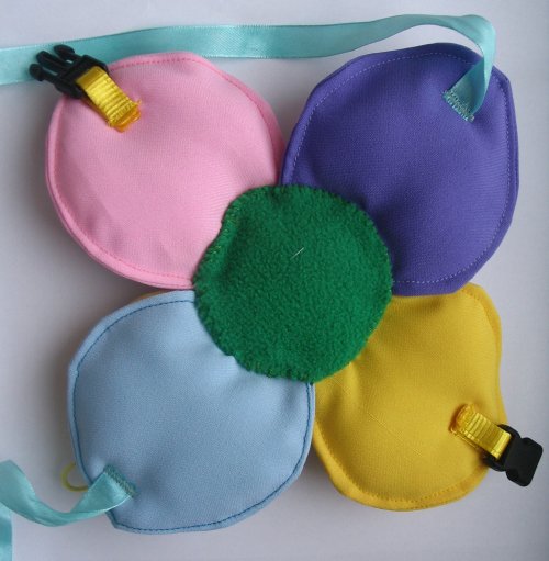 Цветок. Все лепестки из замши, отгибаются (пришиты у основания), шуршат, один не шуршит, внутри него пуговицы, ребенку надо на ощупь его отыскать. Вверху пришита бабочка. Листок тоже пришит у основания, внутри него бусинки.