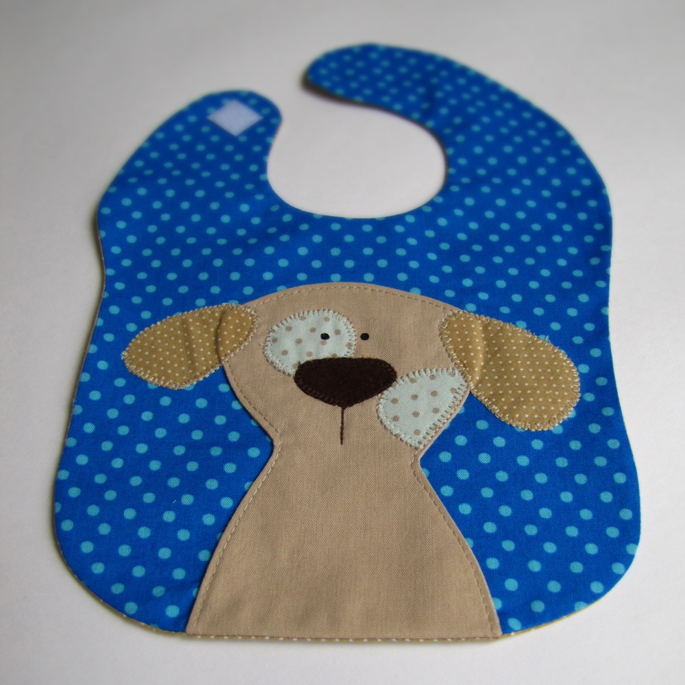 Для создания данной аппликации – «собачки» вам нужно 2 детали тельца вырезать и стачать, вывернуть на изнанку и разутюжить. Отстрочить ее на передней части слюнявчика. Пятнышки и ушки продублировать флизелином и отстрочить на слюнявчике строчкой для пришивания аппликаций. В самую последнюю очередь пришиваем нос (он у меня из тонкого фетра) и отстрачиваем полоску под носом. Глаза я нарисовала акриловыми красками для ткани, но можно их вышить, либо пришить пуговицы.