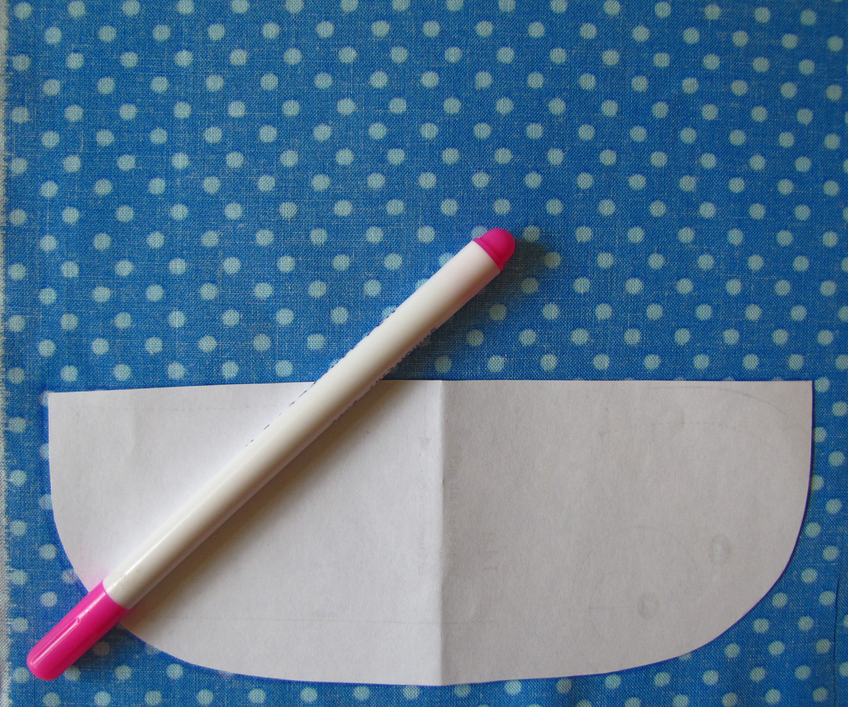 Для начала распечатываем выкройку формата А4, вырезаем ее и раскладываем на ткани. Чтобы «не поехала» выкройка, закрепляем булавками (при необходимости) и обводим исчезающим маркером. У меня слюнявчик получился размером 18,5 х 28,5 см (от горловины до низа – 16,5 см). Если вам нужен для вашего ребенка больший размер – увеличьте выкройку.