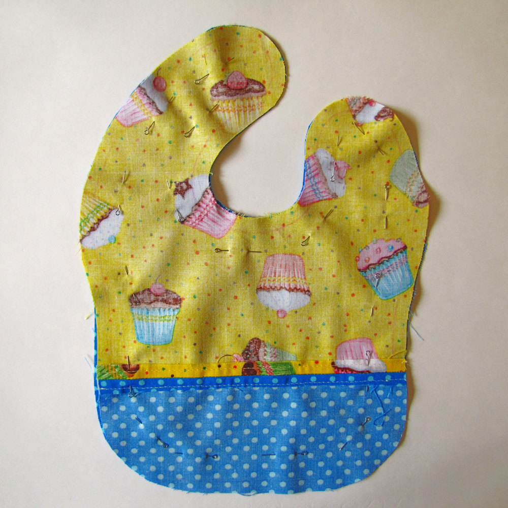 Оформляем переднюю часть слюнявчика. Для этого стачиваем верхнюю и нижнюю его часть, предварительно скрепив булавками.
