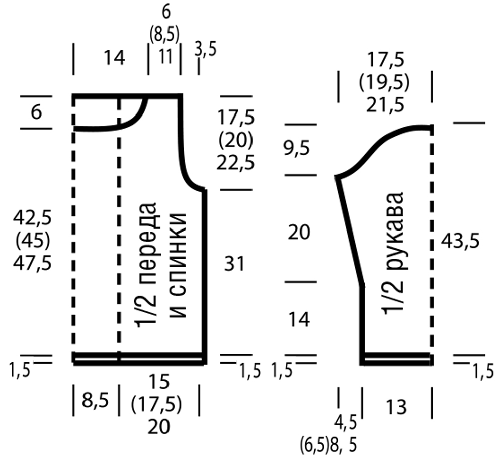 Через 34 см = 82 ряда от планки закрыть для оката рукава с обеих сторон 1 x 3 п., затем в каждом 2-м ряду закрыть 3 x 2 п., 3 x 1 п., 2 x 2 п. и 2 x 3 п. (3 x 2 п., 2 x 1 п., 3 x 2 п. и 2 x 3 п.) 8 x 2 п. и 2 x 3 п. Оставшиеся 14 (18) 20 п. закрыть через 43,5 см = 104 ряда от начального ряда.