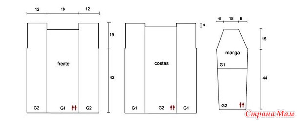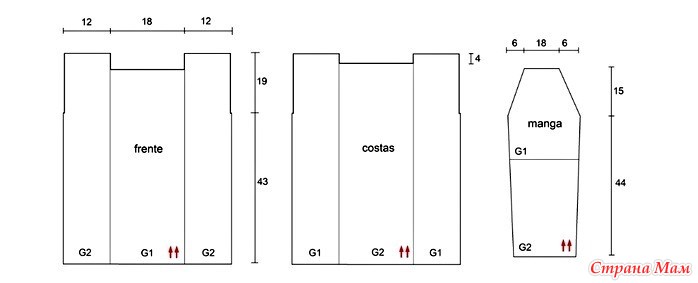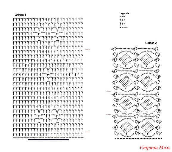 Перед и спинка.Сначала вяжется цетральный узор снизу вверх по схеме 1 а затем от него в стороны вяжется продолжение узором по схеме 2.
