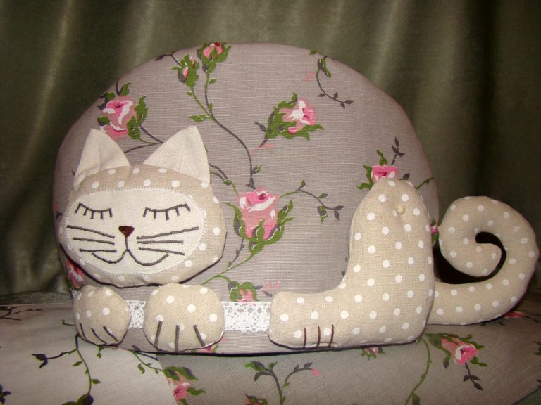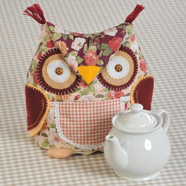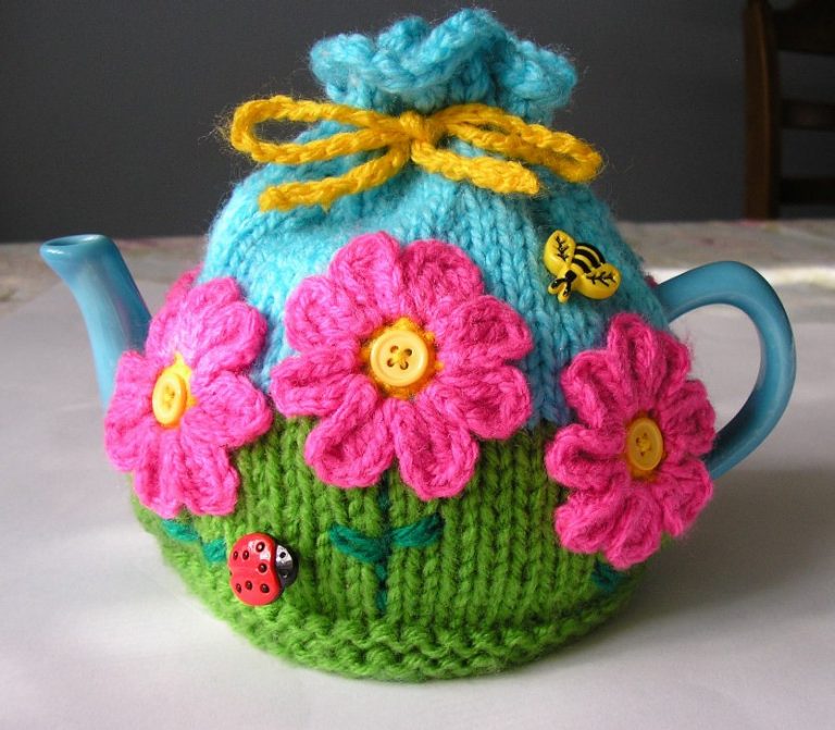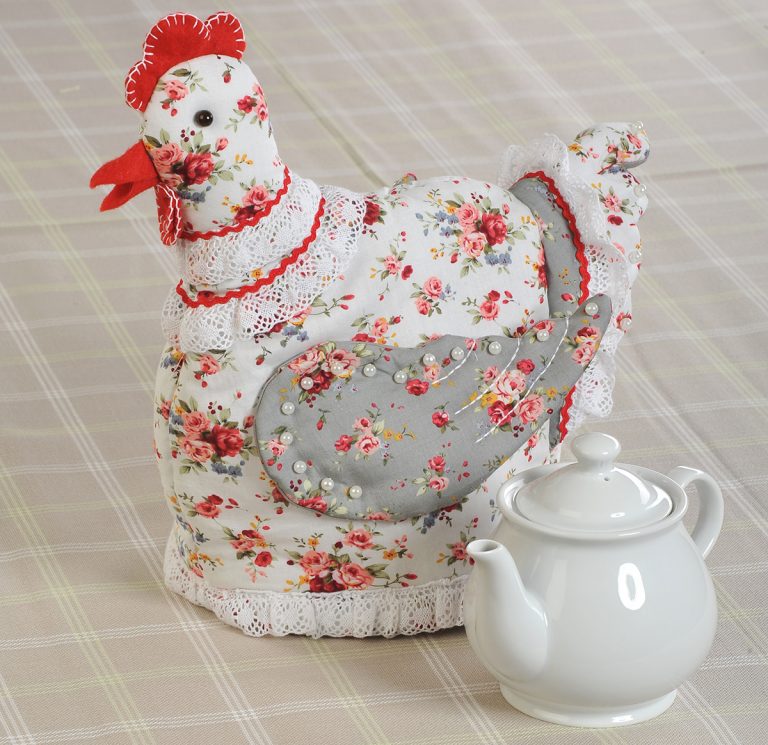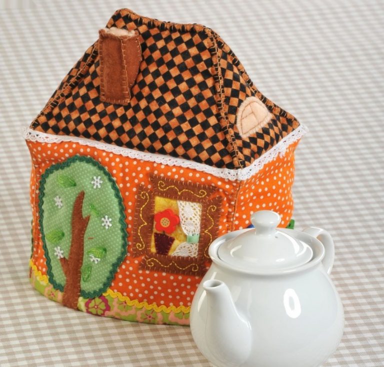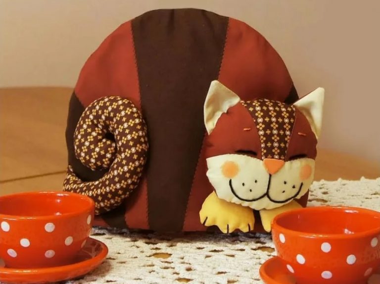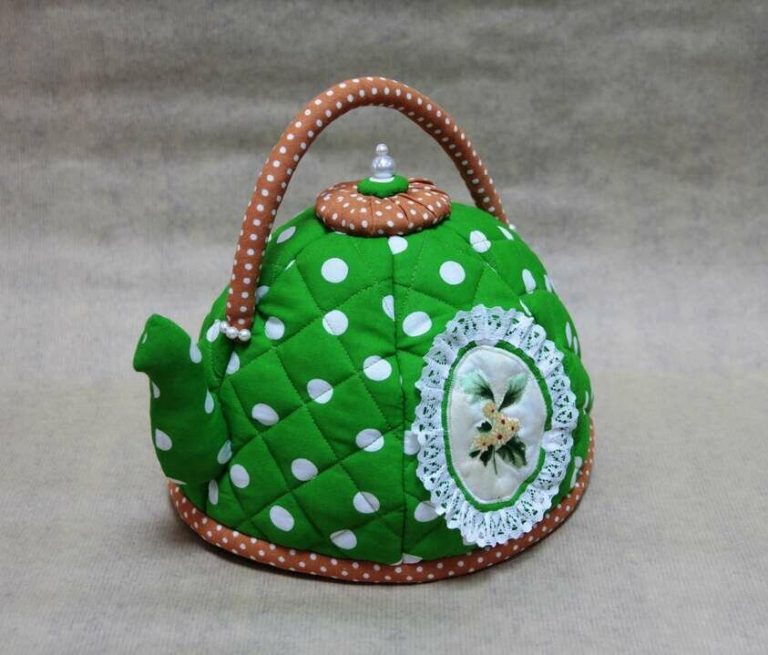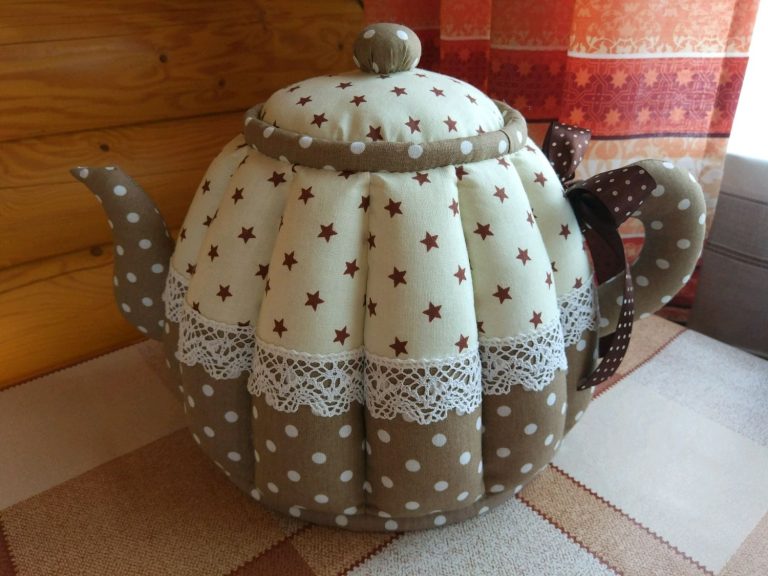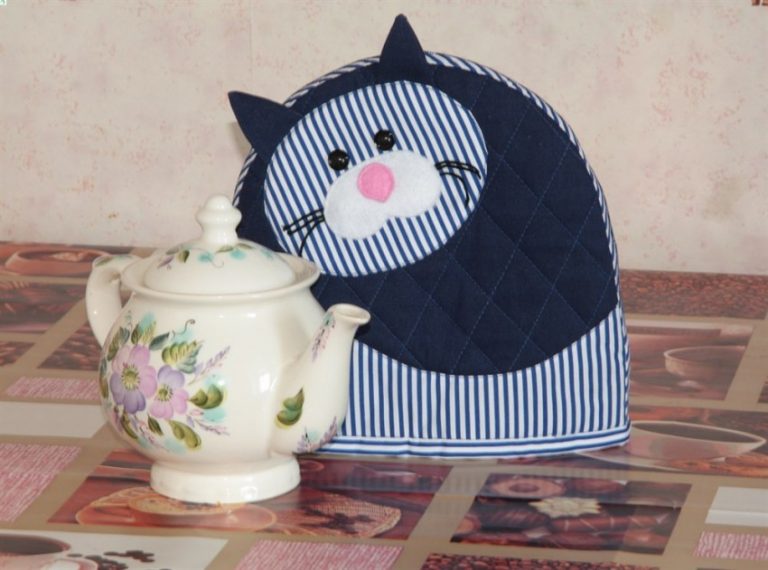 Форма грелки в виде чайника не менее популярна. Она проста в изготовлении, а украсить её можно как угодно.