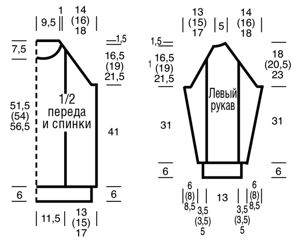 Вязать, как спинку, но для скосов реглан подчеркнуто убавить в каждом 2-м ряду только 19 (22) 25 х 1 п.