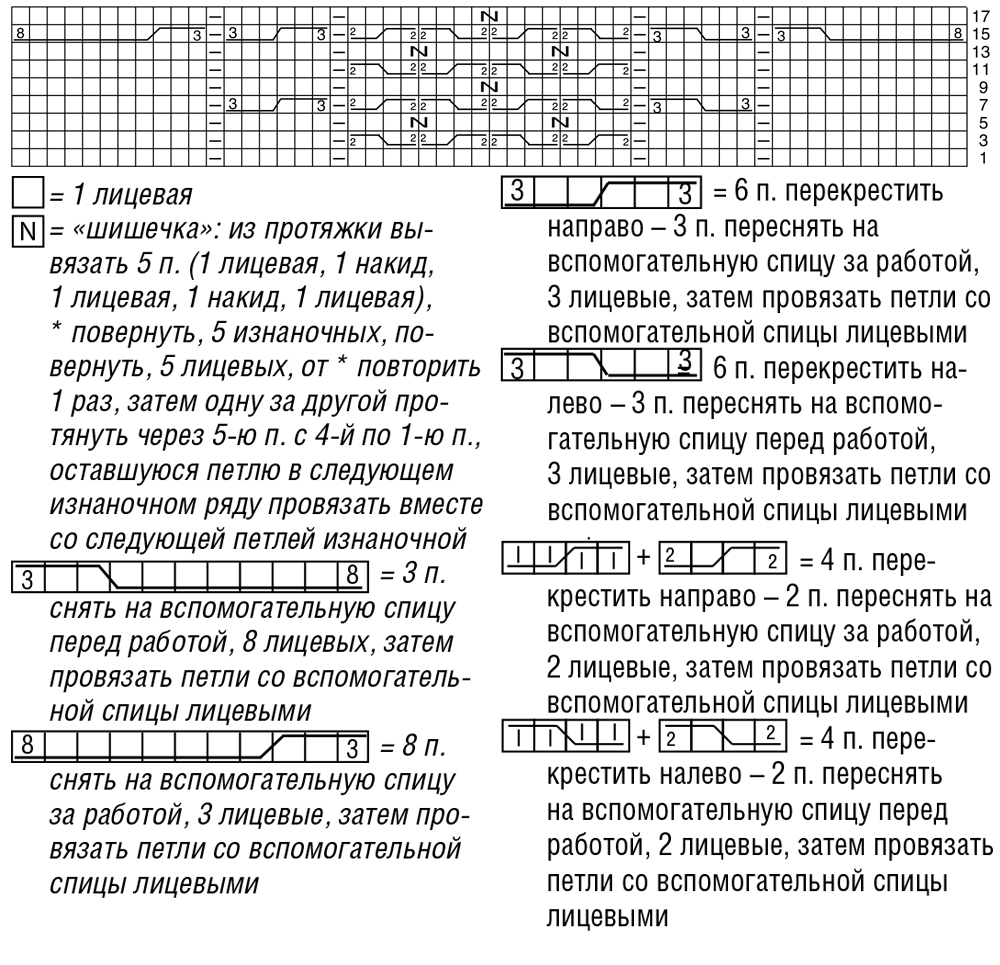 Вязать (спицы №5) по приведенной схеме. На схеме даны только лицевые ряды. В изнаночных рядах петли вязать согласно узору. Провязать 1–18-й р., затем постоянно повторять 3–18-й р.