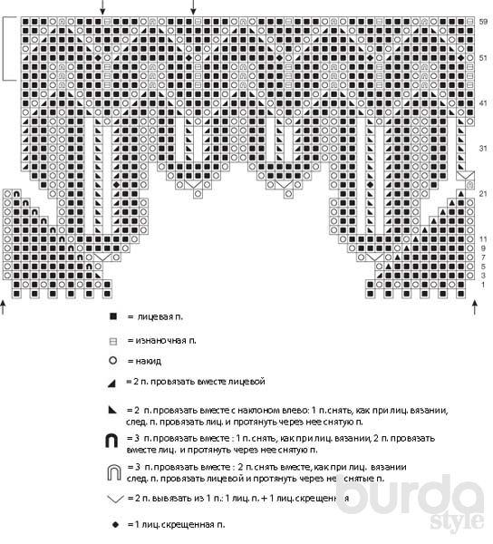 После 60-го круг. р. вязать. повторяя отмеченный с верхнего края стрелками раппорт = 10 п. и постоянно повторять круг. р. 47-60.