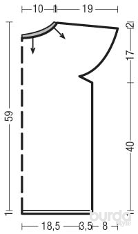 Вязать модель одним полотном сверху вниз по кругу. Стрелки на выкройке указывают направление вязания.