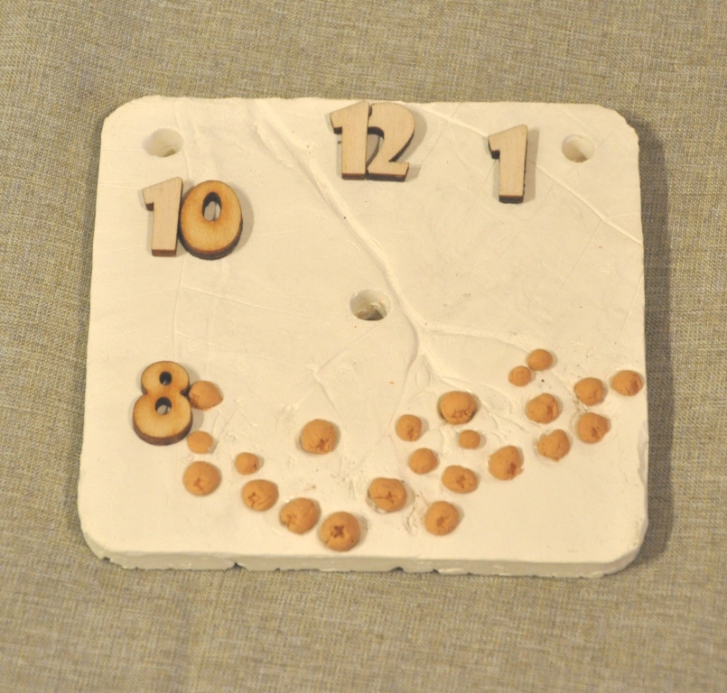 Сначала я не планировала делать циферблат, но потом подумала: не пропадать же цифрам, оставшимся у меня раскомплектованными, а по размеру они отлично подходили. Ну в самом деле, ну почему только 12, 3, 6 и 9? Пусть будут 8, 10, 12, 1.