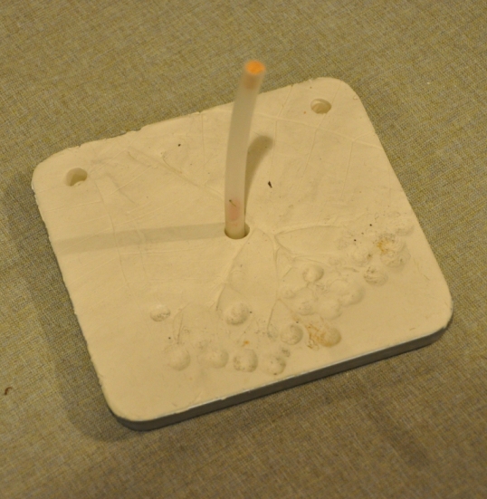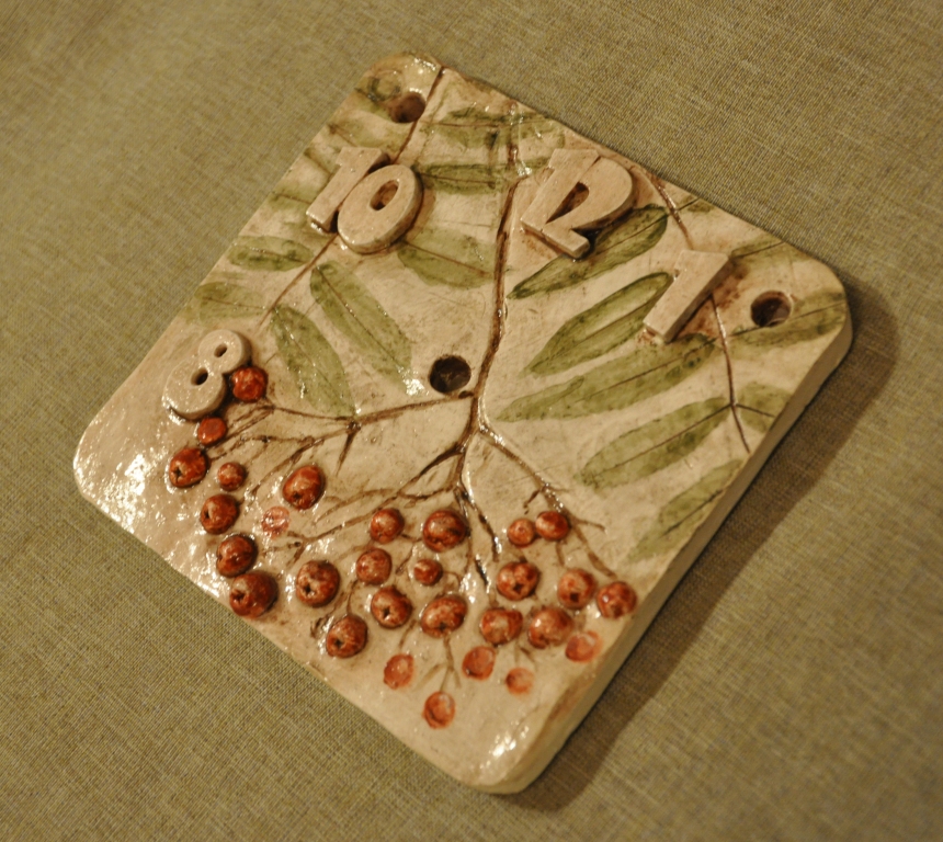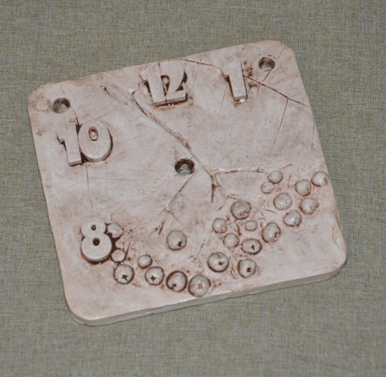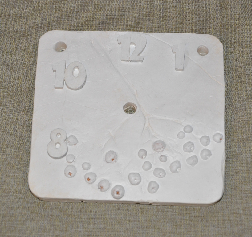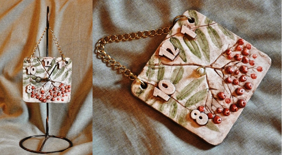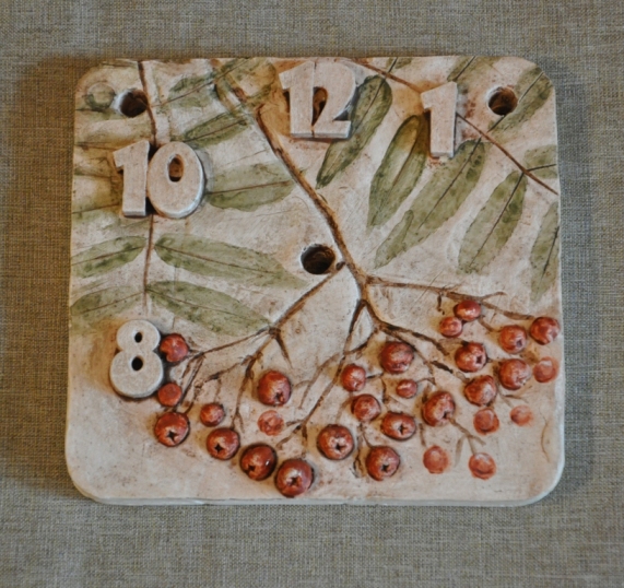 После того, как композиция найдена, хорошо прижимаю рябину к глине, так, чтобы остался заметный оттиск. Сразу же делаю отверстия для часов и подвески.