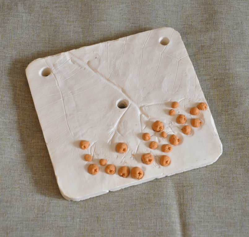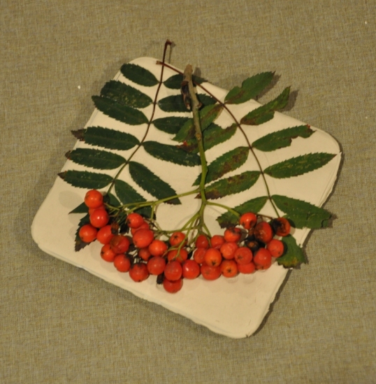 После этого начинается поиск наилучшего расположения ветки на поверхности глины. Это не так просто, как кажется! С одной стороны, лучше, если вся поверхность будет заполнена листьями и ягодами, но и перегруженности надо избегать (я, кстати, в этой работе допустила ошибку, оставив правый нижний угол слишком свободным)