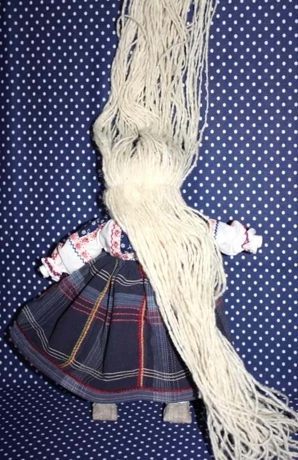 Юбки готовы, можно пришивать волосы. Рекомендуется делать их из льна, но у меня девушки молодые и серый лен мне не подходит. Я взяла нитки, длина их - два росточка куклы. На лице иголочками отметить линию пришива волос от уха до уха. Найти середину у ниток, наложить на линию пришива волос и швом "назад иголку" пришить их.