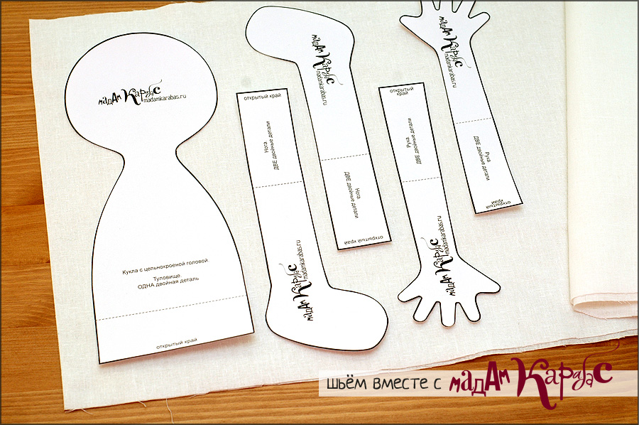 Взяли выкройку и вырезали её, разложили на ткани, сложенной в два слоя. Раскладываем детали параллельно кромке ткани т.е. по долевой*. Важно, чтобы крой деталей был «по прямой» т.е. по долевой нити, а не «по косой», иначе при набивке части тела куклы деформируются.