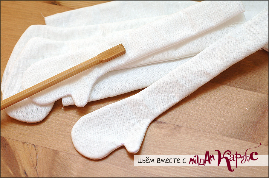 Детали ручек и ножек до конца набивать не надо. Чтобы кукла сидела хорошо, ножки набивают только до середины т.е. до линии, которая обозначена на выкройке пунктиром. Важно, чтобы парные детали были симметричны.