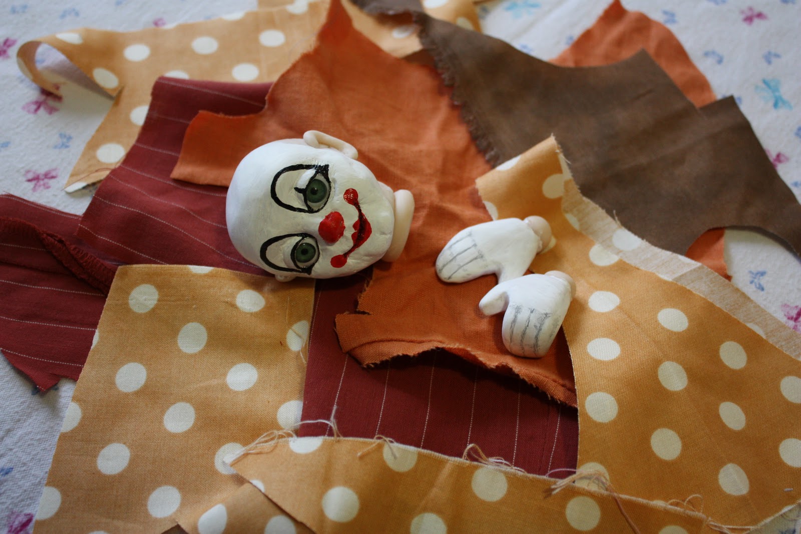 Откопала все имеющиеся у меня обрезки (то, что отсталось от недавно сшитого домового) + соорудила голову и руки для клоуна.
