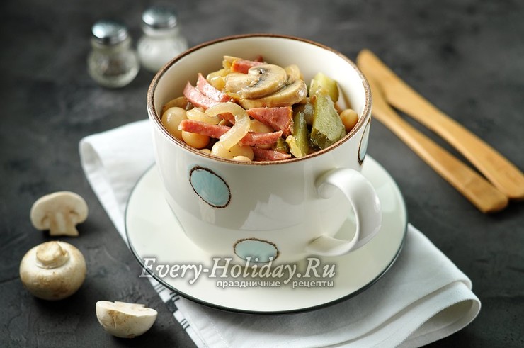 Не смотря на самые простые продукты в составе, салат с фасолью, жареными грибами и солеными огурцами получается очень вкусным. Это блюдо можно подавать как закуску, как салат, как гарнир и даже как самостоятельное блюдо.