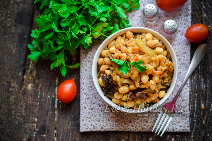 Капуста тушеная с грибами и фасолью – сытное и очень-очень вкусное блюдо, особенно, если его приготовить с сухими грибами, к примеру, с лисичками. Фасоль для рецепта можно использовать любую.