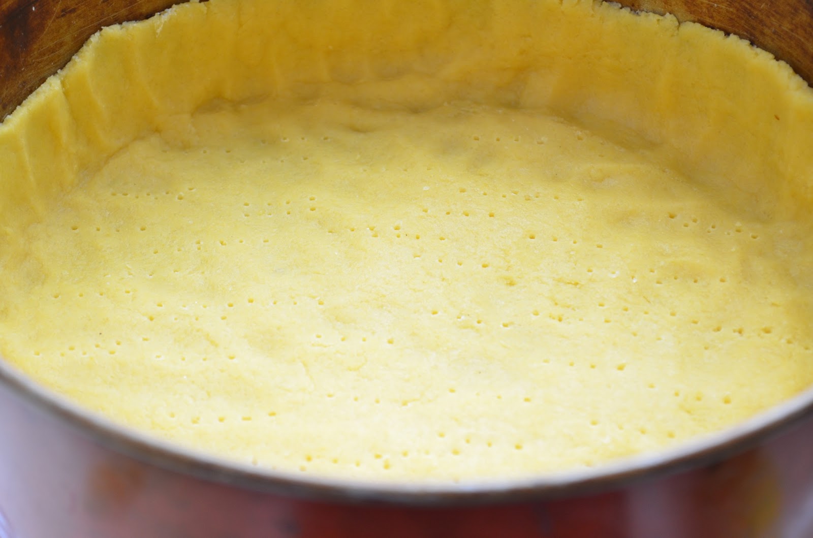 4. Тесто раскатать и перенести в смазанную сливочным маслом разъемную форму 24 см. Сделать ровные бортики примерно 4 см. Наколоть вилкой и поставить в холодильник на 1 час