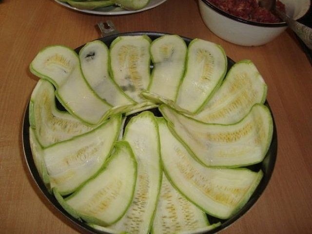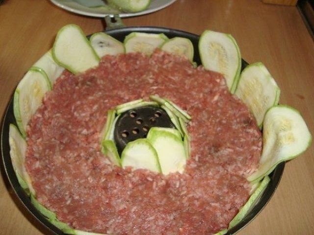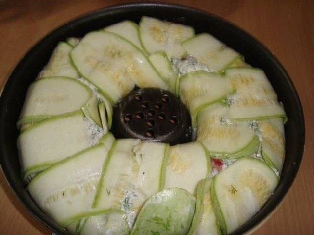 Отварить рис - 3 столовых ложки, смешать с 500гр. фарша. Посолить, поперчить. Грибы 300гр порезать небольшими дольками, лук полукольцами. Обжарить на растительном масле. Кабачок очистить от кожуры, нарезать вдоль тонкими (чем тоньше, тем лучше) ломтиками 3мм,слегка присолить. Форму для кекса смазать растительным маслом, уложить кабачки, так чтобы края кабачков свисали.