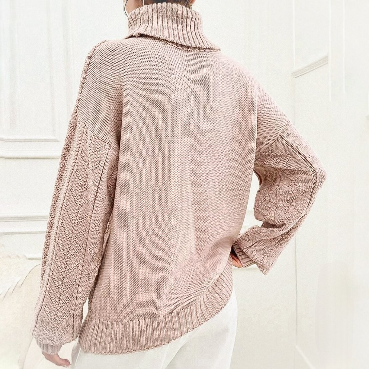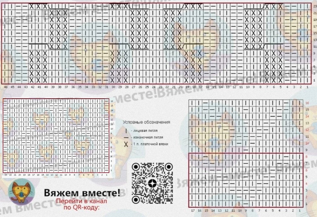 Рукава связаны чередованием нижних узоров, а спинка выполнена полностью лицевой гладью.
