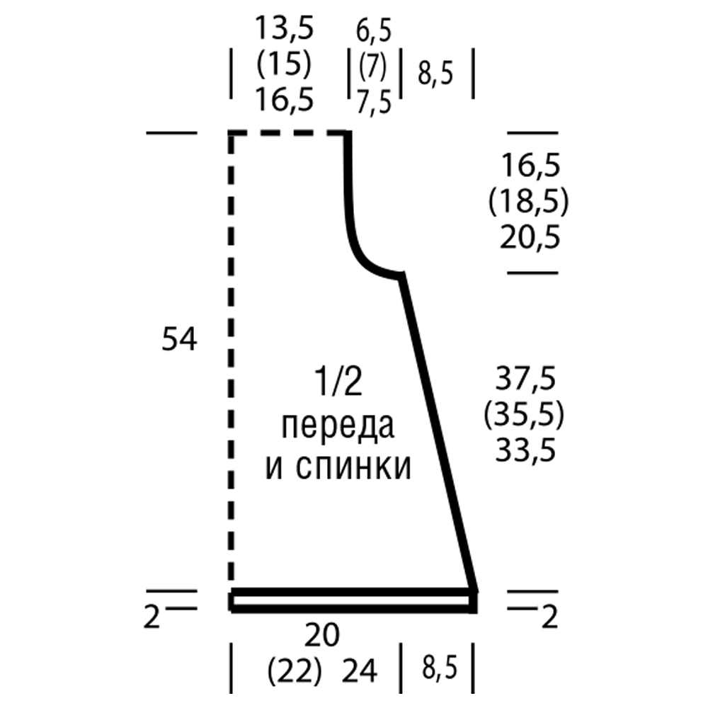 Через 37,5 см = 118 рядов (35,5 см = 112 рядов) 33,5 см = 106 рядов от планки закрыть для пройм с обеих сторон 1 x 7 (8) 9 п., затем в каждом 2-м ряду закрыть 5 x 2 п. = 75 (81) 87 п. Через 54 см = 170 рядов от планки оставить все петли.