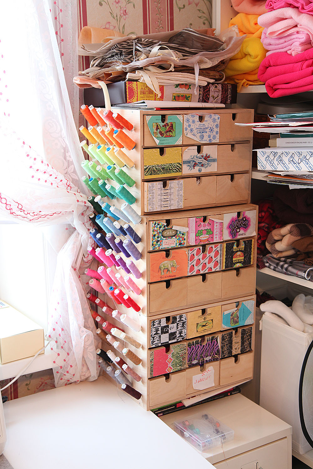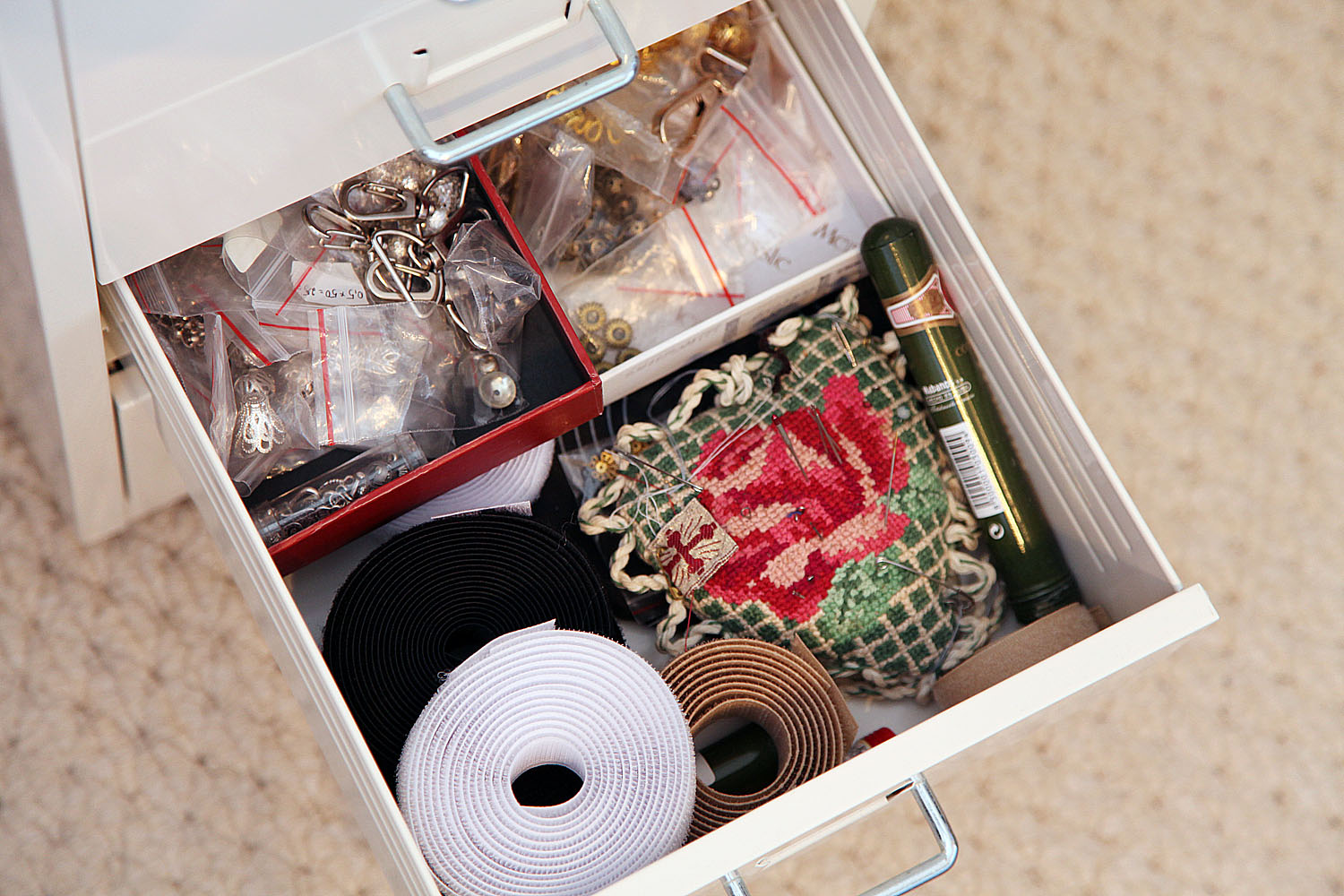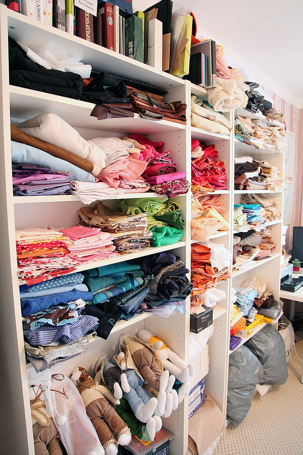 Слева от дивана стоит многофункциональный шкаф. В нем всякое нужное: ткани, заготовки, и много-много всего.