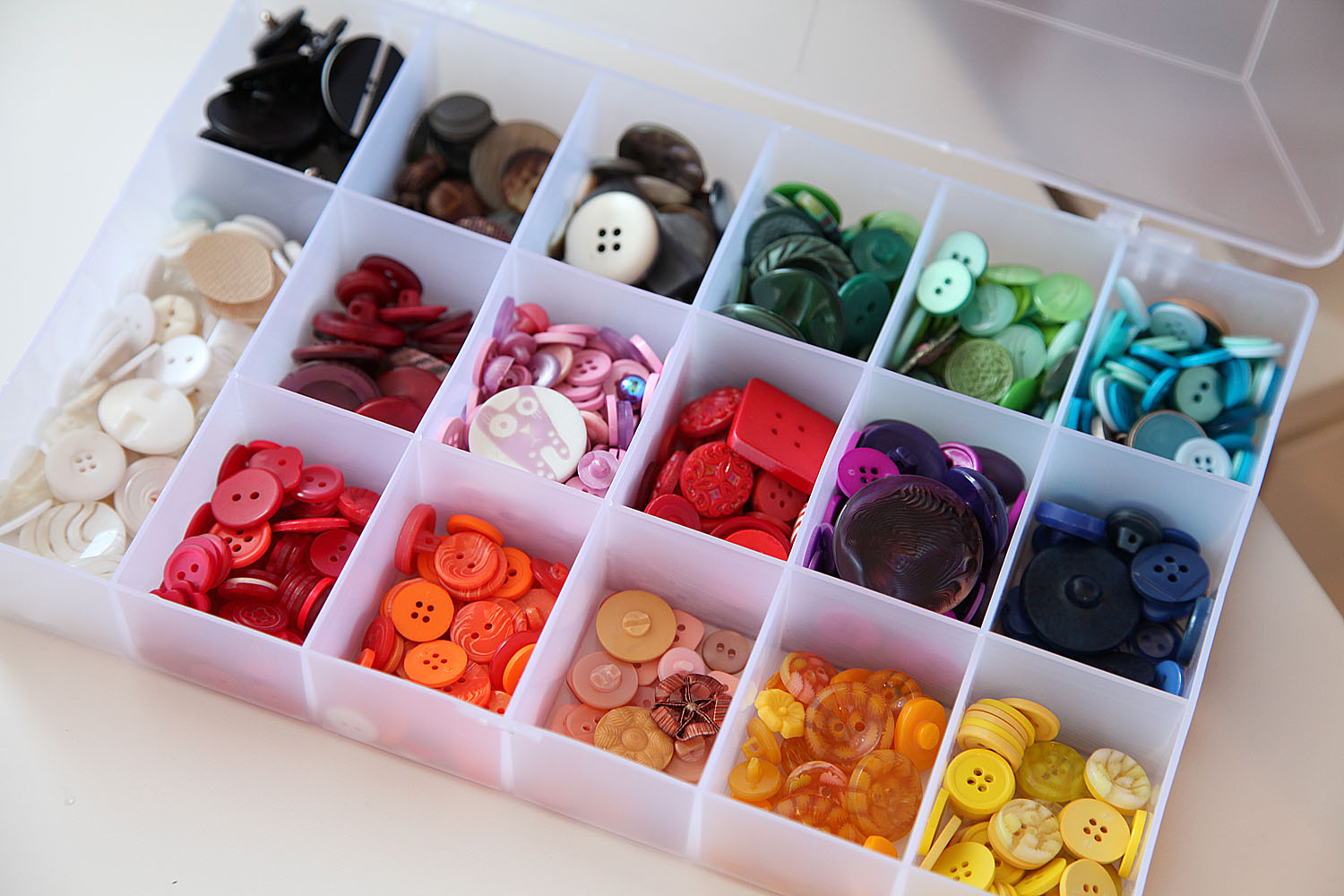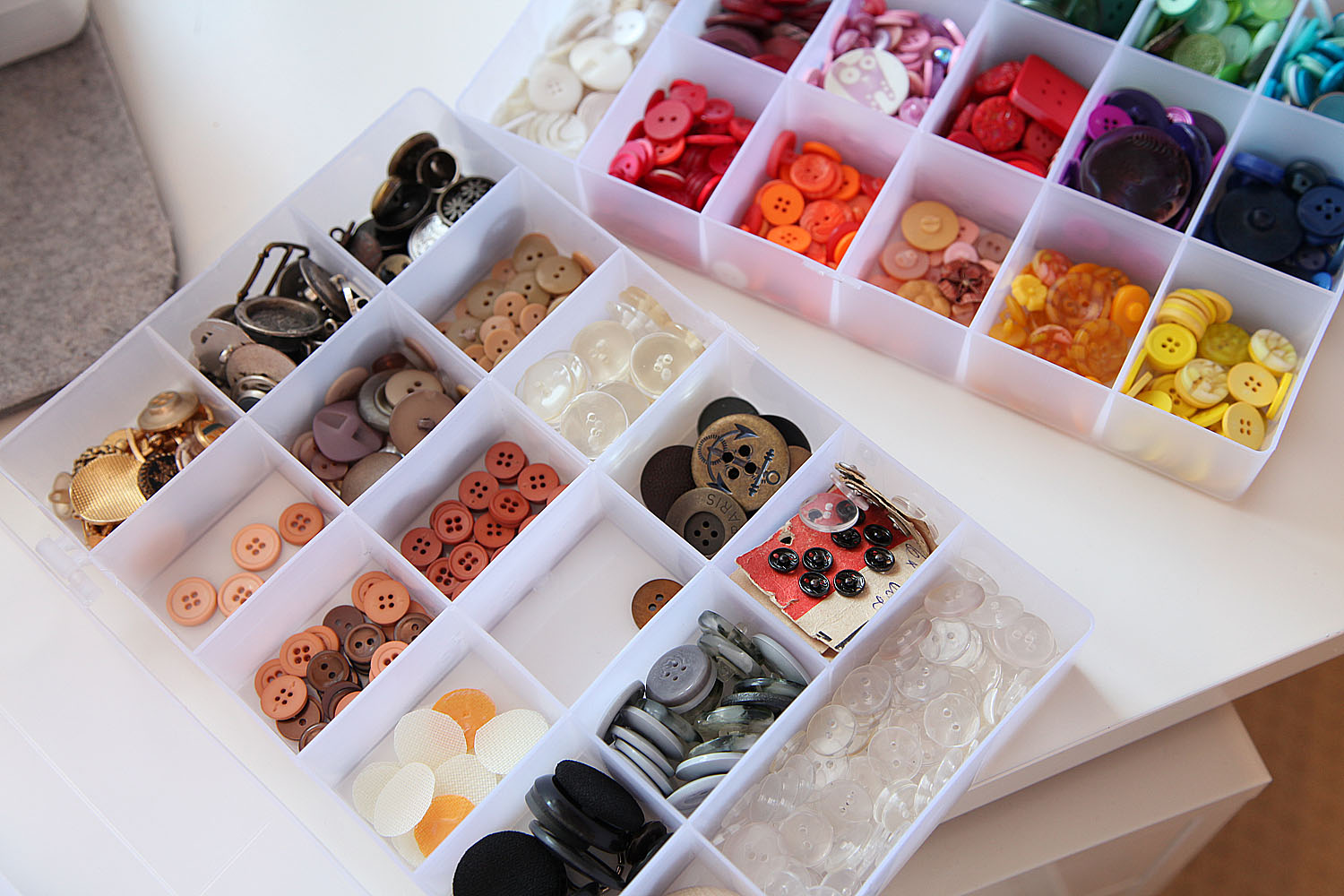 Во втором сверху ящике лежит пистолет, запаски к нему, нитки для лап и пуговки для них же.