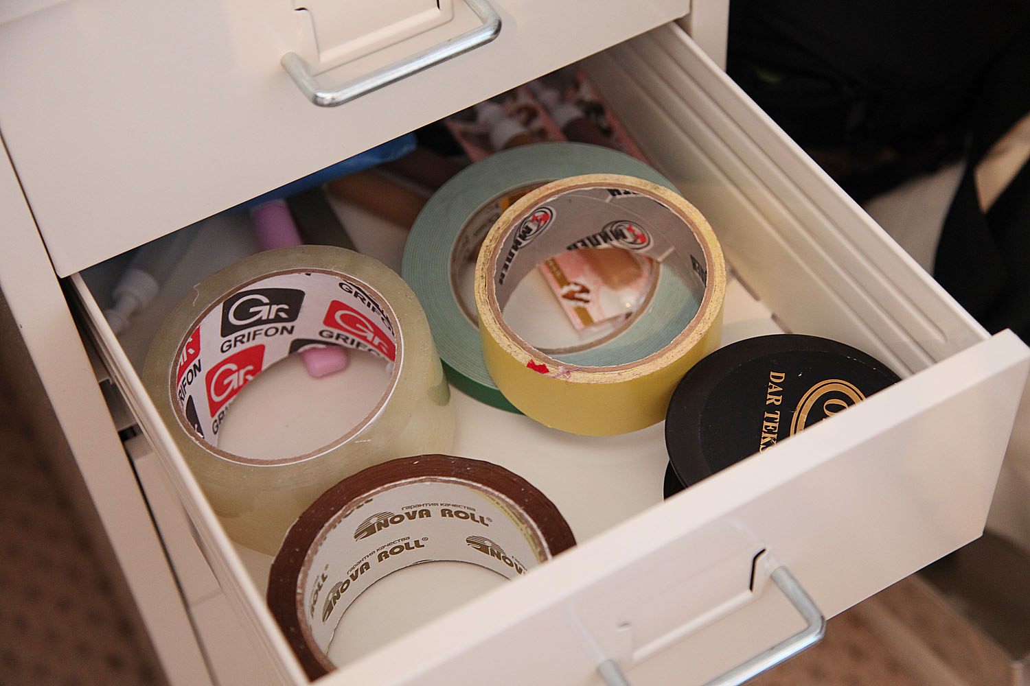 В одном из ящиков лежит различный скотч и разные соусы для полимерки.