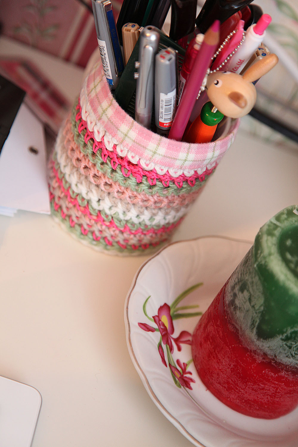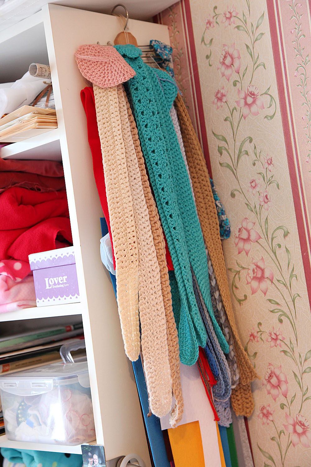 На его торце висят вязаные шарфики. Я делаю их про запас, всегда, когда у меня есть свободная минута.