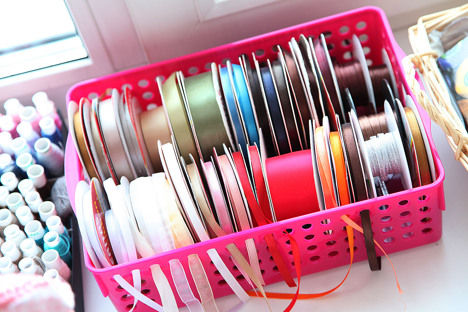 Дальше корзинка с лентами. Это основные цвета. Они используются чаще и покупаются рулонами.