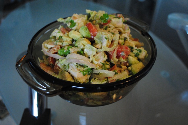 Как вы уже знаете, я нахожусь в постоянном поиске новых интересных салатиков без майонеза! Вот откопала очередной рецепт, попробовала, и пришла в буйный восторг! Во-первых, салатик очень полезный и здоровый: в нем нет ни майонеза, ни сметаны, ни даже растительного масла! Во-вторых, он позволяет утилизировать оставшуюся от вчерашней запеченной курицы грудку. И, в-третьих, он очень сытный и заменяет собой целый ужин. Итак, мой новый любимый салат!