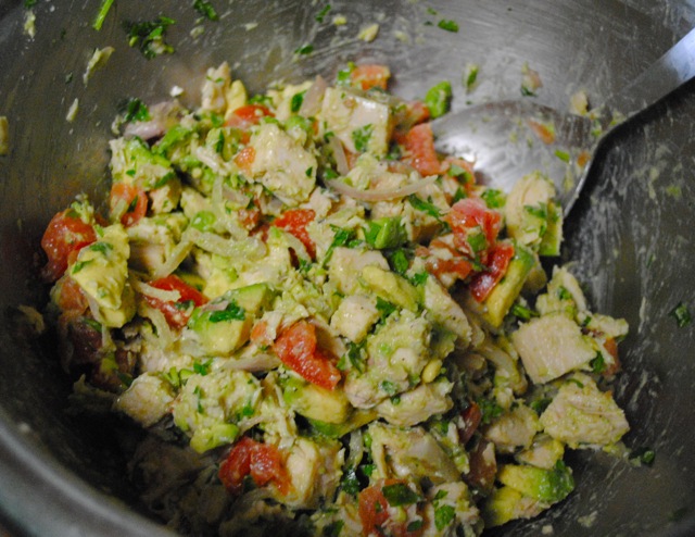 В миске соединяем нарезанные курятину, помидор, авокадо, лук и петрушку. Сбрызгиваем оставшимся соком лайма.