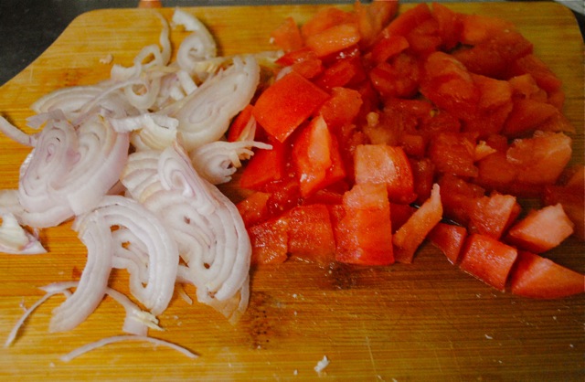 Лук-шалот режем очень тонкими кольцами. Из помидора удаляем семена. Нарезаем помидор некрупными кубиками.