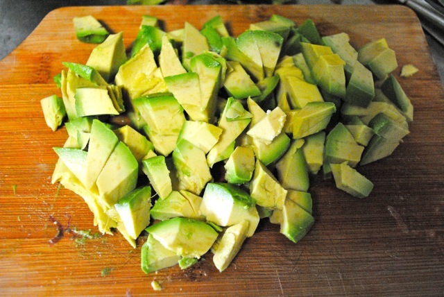 Из авокадо удаляем косточку, очищаем его. Режем кубиками.