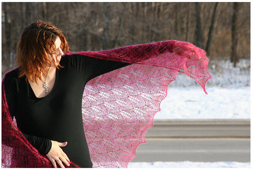 Накидка вяжется одной деталью снизу вверх. Ажурная кайма вяжется отдельно, затем присоединяется к внешнему краю тела накидки, используя закрытие петель тремя спицами.