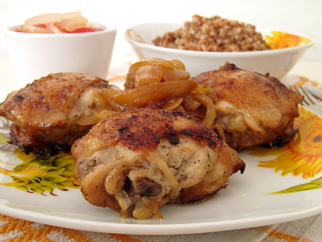 Если вам уже приелась жареная курица, то очень рекомендую приготовить ее именно по этому рецепту. Бедра получаются очень вкусные и нежные, а маринованный лук придает им вкус шашлыка! Новый и интересный вкус с минимумом затрат!! Попробуйте!!!