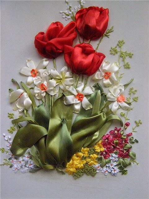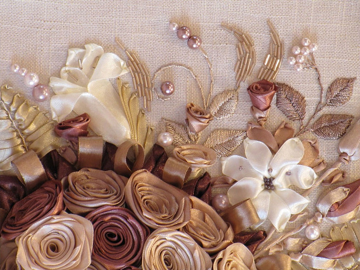 Вышивка шелковыми лентами — вид художественного рукоделия, определенный способ вышивания какого-либо рисунка на канве различной плотности с помощью иглы и цветных шелковых лент. Насчитывает огромное количество видов швов и техник. Находится на пике популярности из-за сравнительно простой техники и неимоверной красоты результатов. Вышивка шелковыми лентами широко применяется в создании оригинальных художественных картин и церковных икон. Кроме того, она является главным атрибутом в оформлении торжественных церемоний и праздников: лентами и рюшами расшивается свадебное платье невесты, сумочки, носовые платки, салфетки и скатерти на столах. Вышивками из шелковых лент декорируются конверты для новорожденных, коробки для подарков, букеты цветов и прочее.