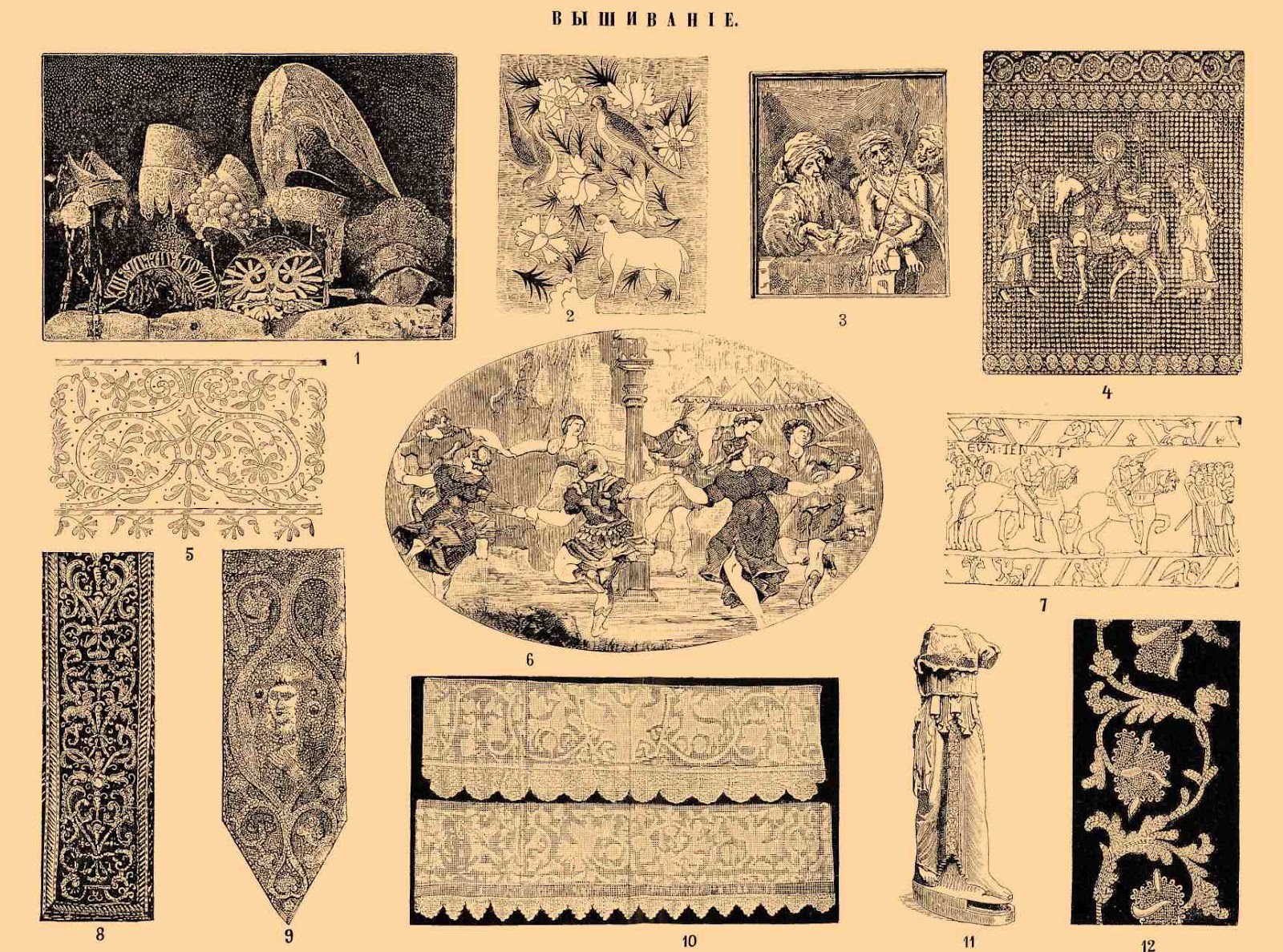 Страсть к украшению себя и своей одежды с целью выделиться чем-нибудь из окружающей среды свойственна человеческой природе, даже в первобытном, полудиком её состоянии; так, например, краснокожие индейцы украшают одеяла различными вышивками; лапландцы на своей одежде из оленьей кожи вышивают самые разнообразные узоры. Вышивкой украшали не только одежду, но и ковры, и декоративные панно с изображением деревьев и птиц. Вышивание известно было в глубокой древности, и, как многих других отраслей искусства и науки, колыбелью его был Восток. Наиболее древние вышивки, дошедшие до наших дней, относятся к VI – V вв. до н.э. Они были выполнены в Древнем Китае на шелковых тканях шелком-сырцом, волосом, золотыми и серебряными нитями.
