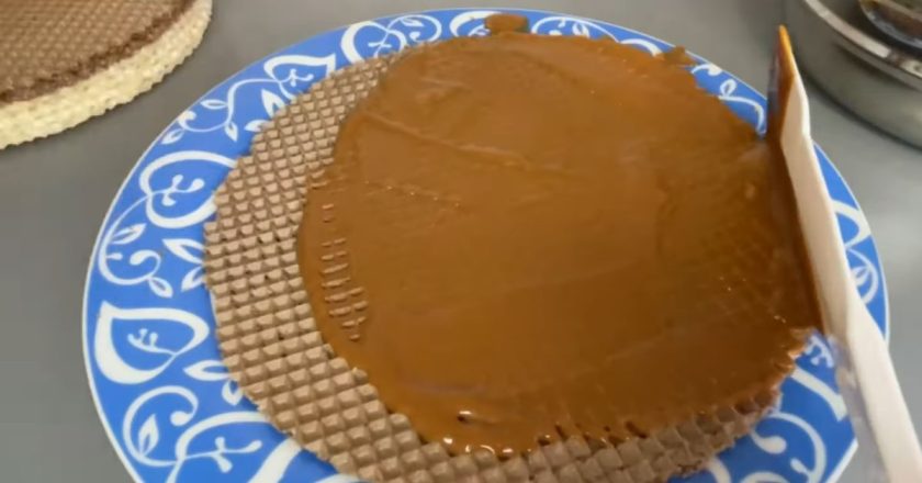 Шоколадный крем накройте третьей вафлей, а её намажьте сгущёнкой. Накройте заготовку последним коржом, слегка придавите десерт. Отправьте его в холодильник минимум на 3 часа.