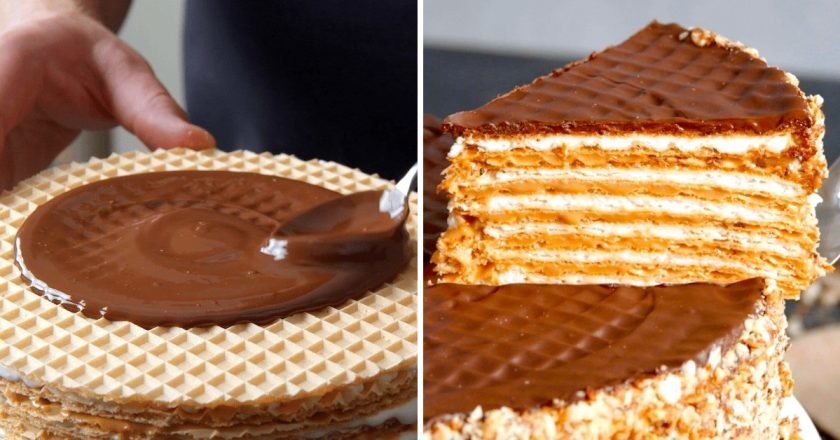 Вот и всё, торт готов. Чтобы сделать его более аппетитным, полейте блюдо сверху растопленным шоколадом. Только пусть он хорошенько застынет перед подачей сладости к столу. А вот шоколадную глазурь готовить не советую, ведь она быстро впитается в вафли, сделает их слишком мягкими.